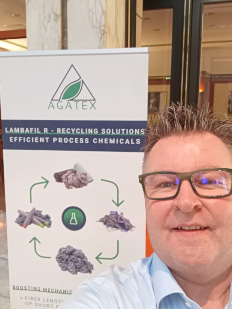Georg Stegschuster, Leiter des Recycling Ateliers Augsburg, erklärt, wo und wofür sich die speziellen Hilfsstoffe des Herstellers einsetzen lassen: „Die Spezialstoffe unterstützen entlang des gesamten Recyclingprozesses. Bereits bei der Aufbereitung und Zerfaserung von ausgemusterten Textilien kann der Zusatz des richtigen Hilfsstoffes wertvolle Faserlänge erhalten. Ein zentrales Kriterium für hochwertiges Recycling. Und sie vereinfachen beispielsweise die Verarbeitung der Fasern in der Spinnerei oder zu Vliesstoffen. Die Kooperation mit der Agatex Feinchemie GmbH ist deshalb ein wichtiger Schritt für die Herstellung hochwertiger Textilprodukte mit hohem Recyclinganteil.“